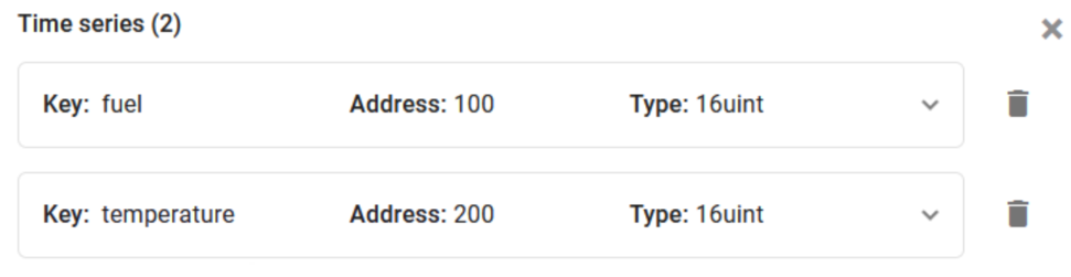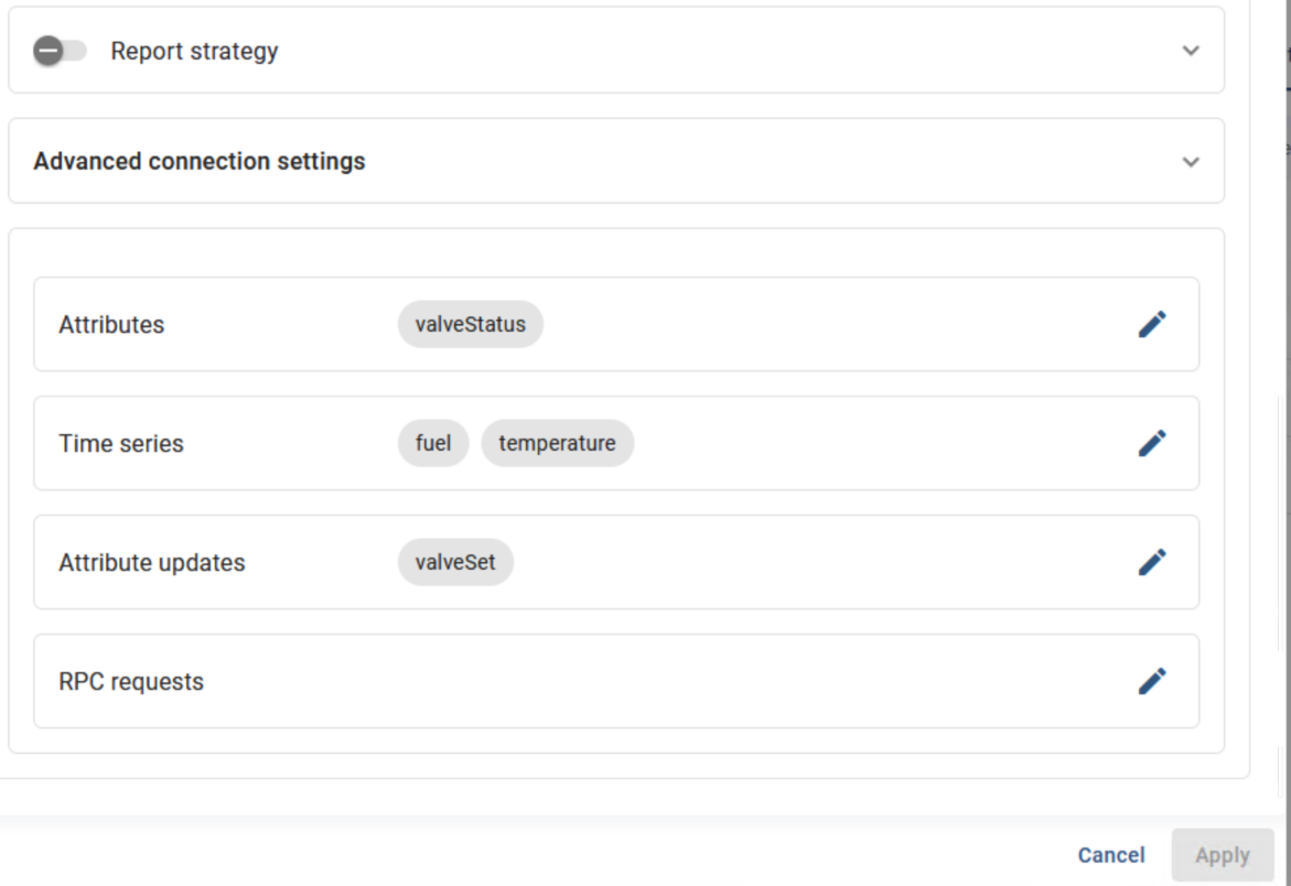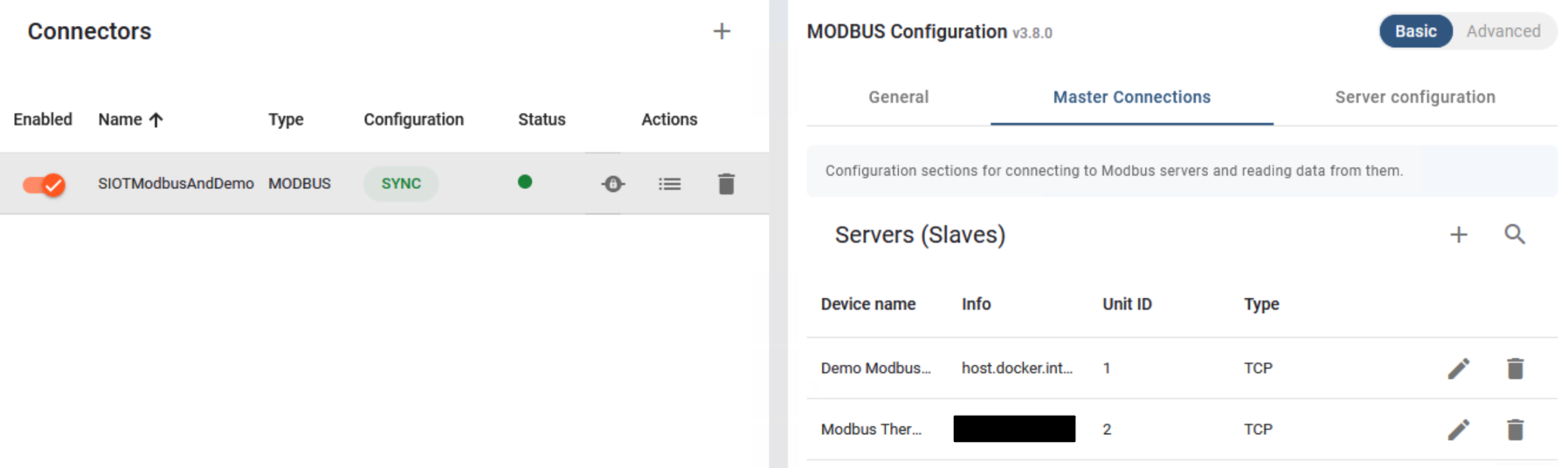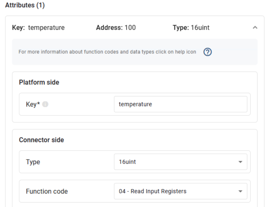 On the Thingsboard side, I have a connector reading 1 register at address 100 from the sim device.