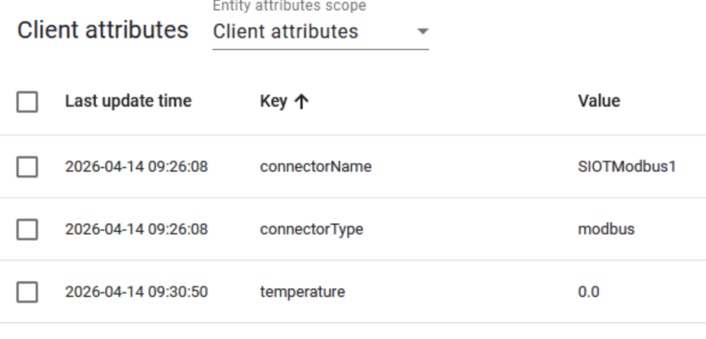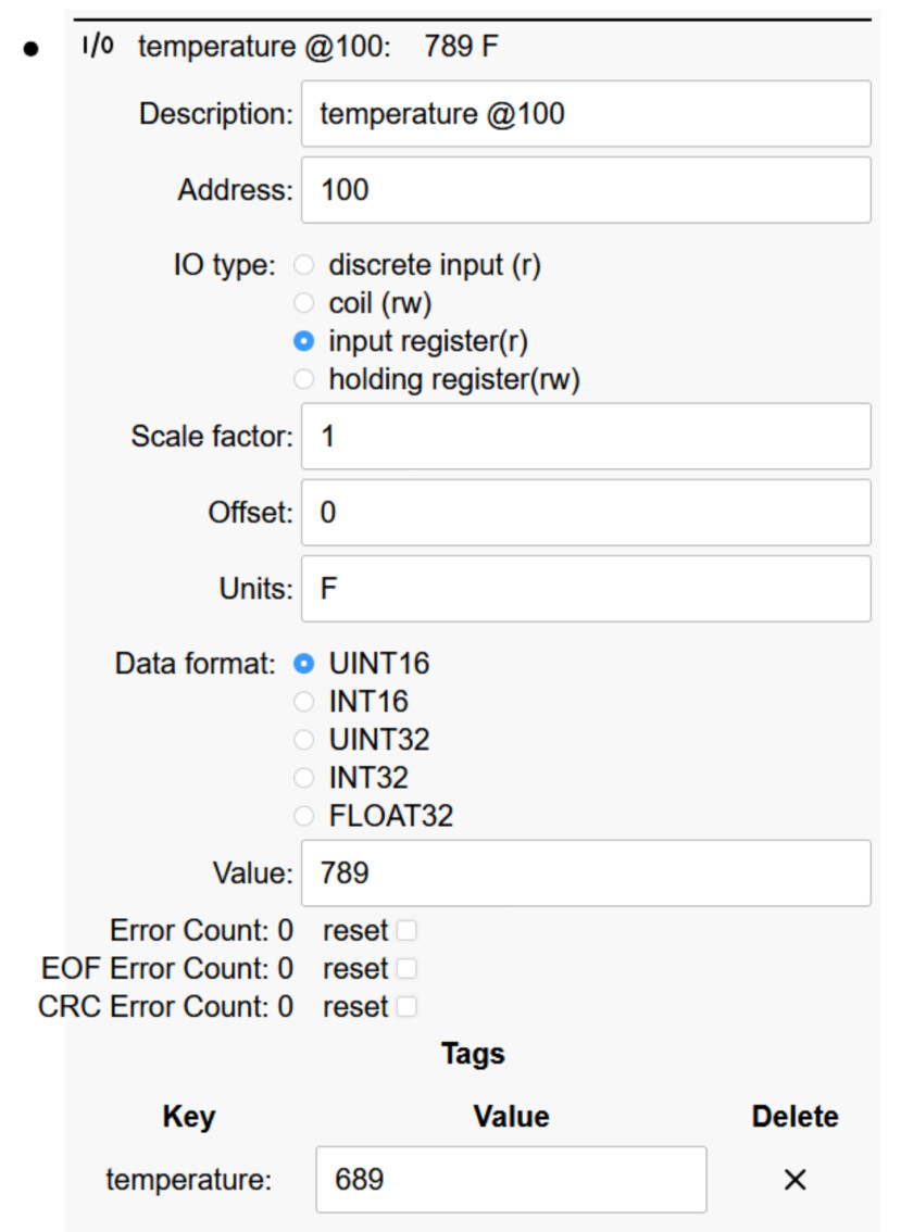 I’ve spun up an SIOT project with 1 Modbus server device to act as a thermostat. It has 1 register at address 100 with a value of 789.