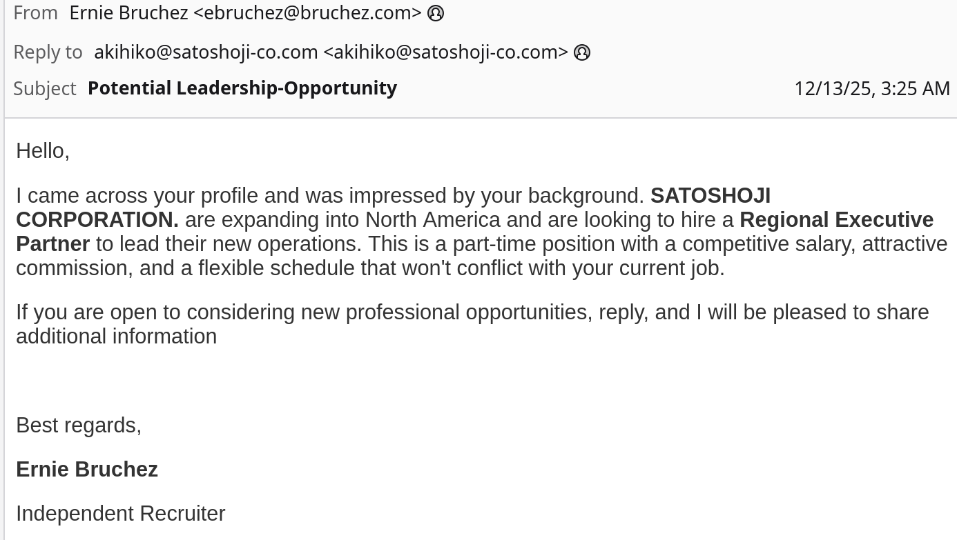 While it appeared to be phony and not something I am remotely interested in, I was curious about the emails - are these valid people? The bruchez domain resolved to an attorney’s firm, and the satoshoji-co.com redirected to the Japanese company. With a little more analysis, it is obvious what they are doing.