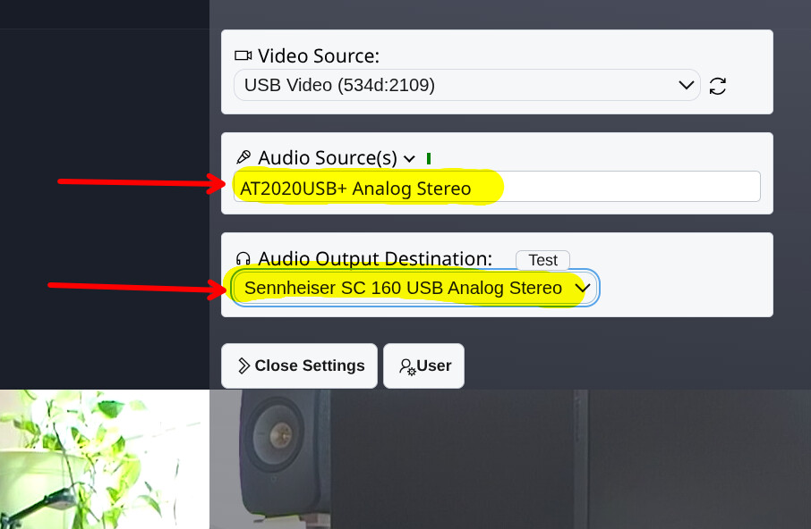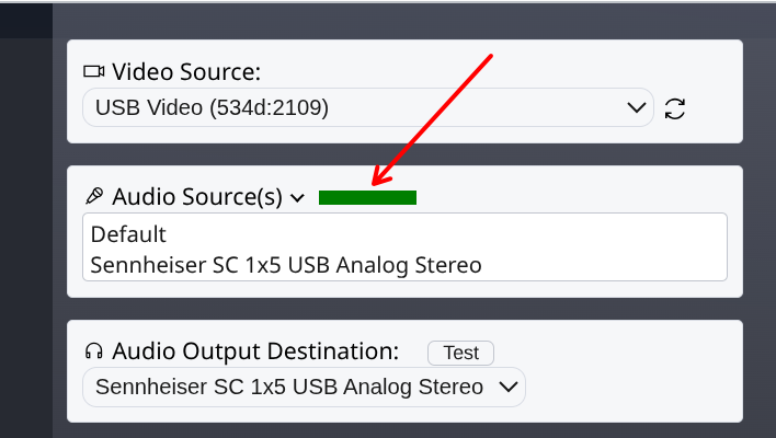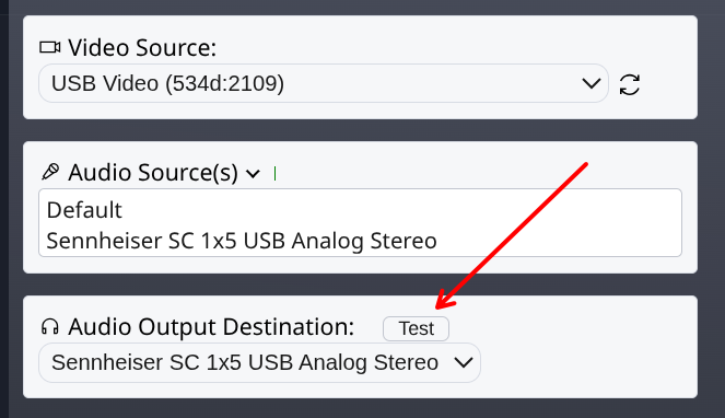 Then make sure both the Audio Source (mic) and Audio Output Destination (speaker) are configured correctly: